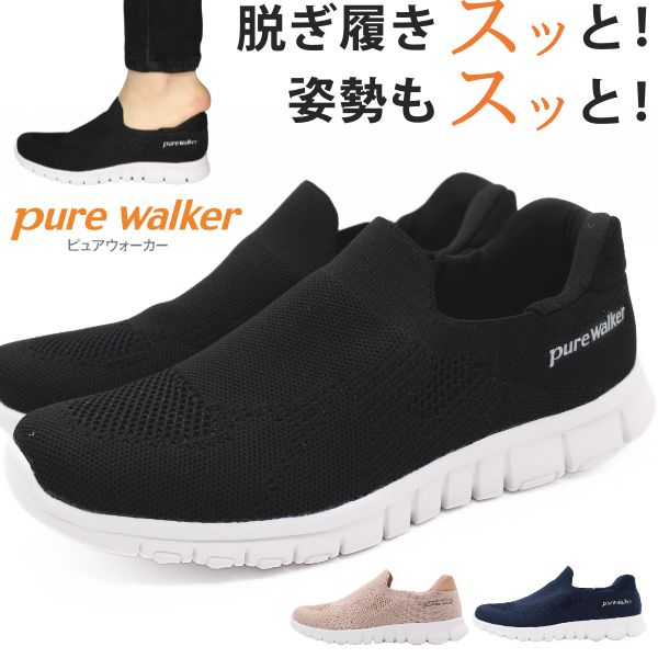 スニーカー レディース 靴 スリッポン 白 ホワイト 紺 ネイビー ピンク 手を使わず履ける ハンズフリー 美脚 姿勢サポート 高機能インソール 高機能中敷き シンプル 軽い 軽量 外反母趾 柔らかい フライニット ピュアウォーカー pure walker PW1502 ショップ:靴のニシムラ